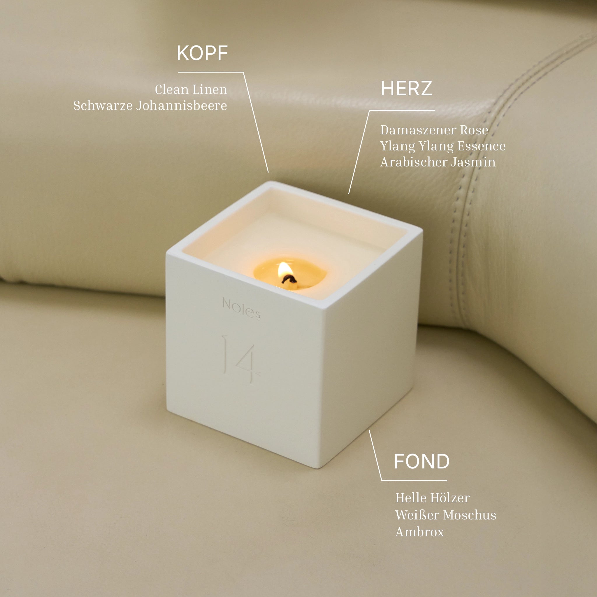Der Signature-Duft NOLES 14 als Duftkerze sorgt für eine ruhige, warme Atmosphäre zu Hause. Die Kombination aus strahlenden weißen Blüten und weichem Moschus erinnert an den vertrauten Geruch von frischer Wäsche. Gegossen in ein minimalistisches Beton-Designobjekt und gefertigt aus pflanzlicher Rapswachsmischung wird die Kerze zum Statement aus Duft, Design und Handwerkskunst.